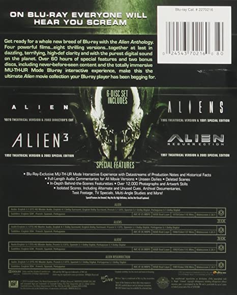 Brace yourself for a whole new breed of Blu ray: Four powerful films...eight thrilling versions...in dazzling, terrifying, high def clarity with the purest digital sound on the planet. Two bonus dics and over 65 hours of archival and never before seen content, including the totally immersive MU TH UR mode feature, makes this definitive Alien collection!