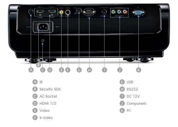 The projector also supports a wide variety of inputs for your equipment, including component video, S-Video, and composite video, as well as dual HDMI, PC, and an output trigger for connection to automated screen and environment lighting systems.