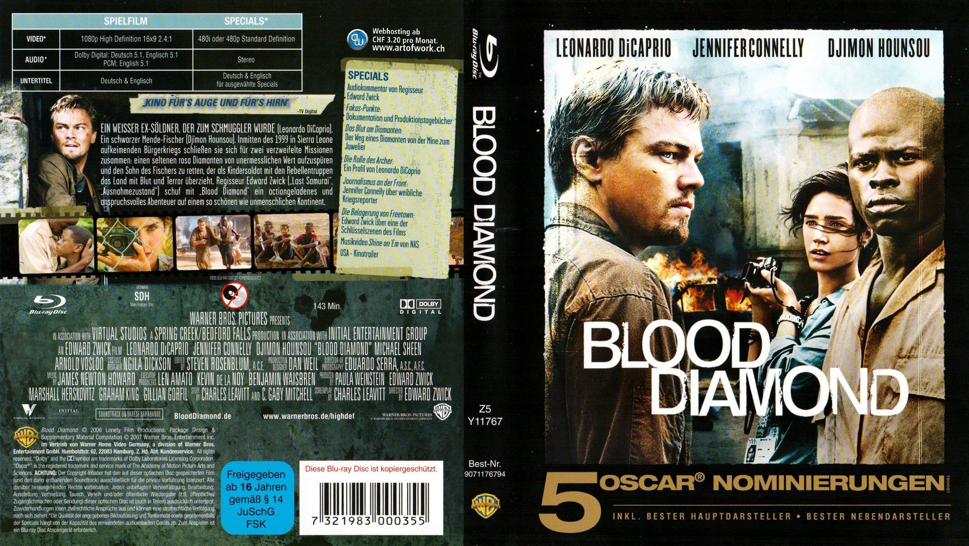 Leonardo DiCaprio puts a handsome face on an ugly industry: in parts of Africa, diamond mining fuels civil warfare, killing thousands of innocents and drafting preteen children as vicious soldiers. DiCaprio (The Departed) plays Danny Archer, a white African soldier-turned-diamond-smuggler who gets wind of a large raw jewel found by Solomon Vandy, a native fisherman (Djimon Hounsou, In America) recently escaped from enslavement by a brutal rebel leader. Archer offers a deal: he'll help Vandy find his war-scattered family if Vandy will share the diamond with him. Drawn into this web of exploitation is journalist Maddy Bowen (Jennifer Connelly, Little Children), who agrees to help if Archer will tell her the details of how conflict diamonds make their way into the hands of the corporations who sell them to the Western world. DiCaprio is compelling because he never flinches from Archer's utter ruthlessness; Archer ends up doing the morally justifiable thing, but only because his desperate greed has led him to it. Hounsou and Connelly, though saddled with all the moral and political speeches, rise above the cant and keep the movie's treacherously formulaic plot rooted in human characters. But in the end, the story won't stick with you as much as the dead stillness in the child soldiers' eyes; the horror of African civil strife refuses to be contained by Blood Diamond's uplifting message--and the movie is all the more potent as a result. --Bret Fetzer