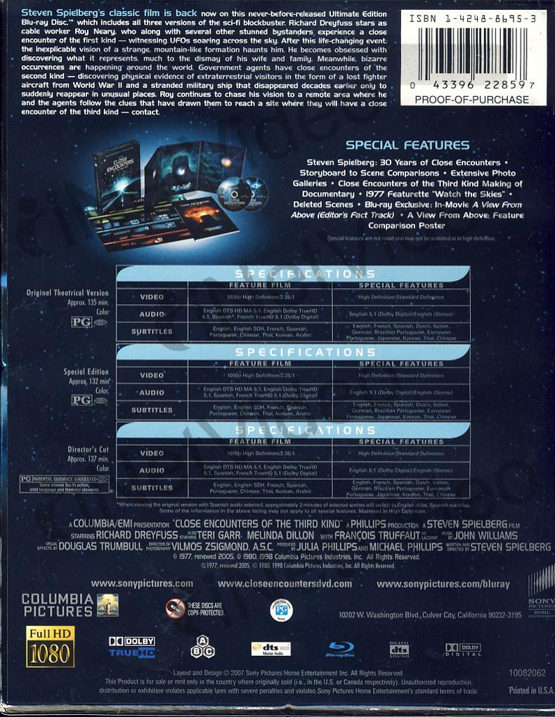Steven Spielberg's classic film is back now on this never-before-released Ultimate Edition DVD, which includes all three versions of the sci-fi blockbuster. Richard Dreyfuss stars as cable worker Roy Neary, who along with several other stunned bystanders experience a close encounter of the first kind - witnessing UFOs soaring across the sky. After this life-changing event, the inexplicable vision of a strange, mountain-like formation haunts him. He becomes obsessed with discovering what it represents, much to the dismay of his wife and family. Meanwhile, bizarre occurrences are happening around the world. Government agents have close encounters of the second kind - discovering physical evidence of extraterrestrial visitors in the form of a lost fighter aircraft from World War II and a stranded military ship that disappeared decades earlier only to suddenly reappear in unusual places. Roy continues to chase his vision to a remote area where he and the agents follow the clues that have drawn them to reach a site where they will have a close encounter of the third kind - contact.