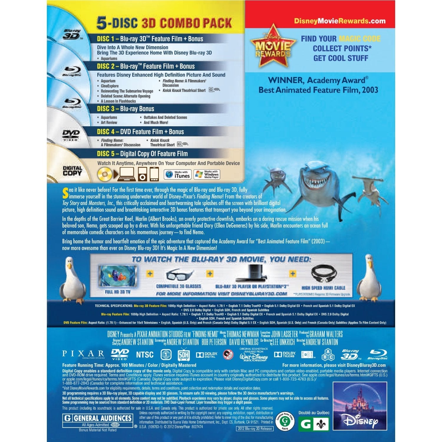 Sea it like never before! For the first time ever, through the magic of Blu-ray and Blu-ray 3D, fully immerse yourself in the stunning underwater world of Disney/Pixar's FINDING NEMO! From the creators of TOY STORY and MONSTERS, INC., this critically acclaimed and heartwarming tale splashes off the screen with brilliant digital picture, high definition sound and breathtaking bonus features that transport you beyond your imagination. In the depths of the Great Barrier Reef, Marlin (Albert Brooks), an overly protective clownfish, embarks on a daring rescue mission when his beloved son, Nemo, gets scooped up by a diver. With his unforgettable friend Dory (Ellen DeGeneres) by his side, Marlin encounters an ocean full of memorable comedic characters on his momentous journey -- to find Nemo. Bring home the humor and heartfelt emotion of the epic adventure that captured the Academy Award for "Best Animated Feature Film" (2003) -- now more awesome than ever on Disney Blu-ray!