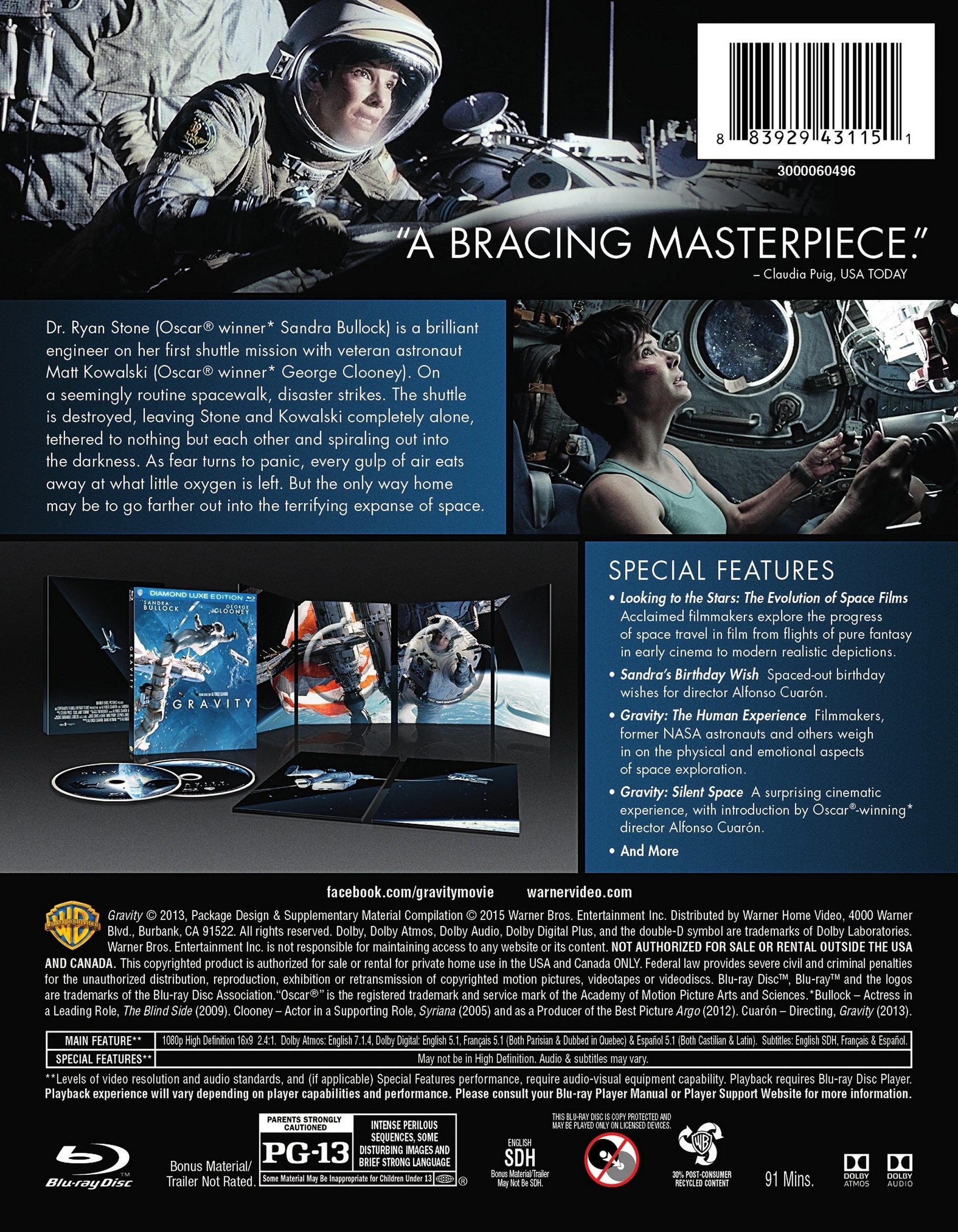 Gravity directed by Oscar nominee Alfonso Cuaron, stars Oscar winners Sandra Bullock and George Clooney in a heart-pounding thriller that pulls you into the infinite and unforgiving realm of deep space. Bullock plays Dr. Ryan Stone, a brilliant medical engineer on her first shuttle mission, with veteran astronaut Matt Kowalsky (Clooney). But on a seemingly routine spacewalk, disaster strikes. The shuttle is destroyed, leaving Stone and Kowalsky completely alone. Special Features - Collision Point: The Race to Clean Up Space Aningaaq - A Short Film by Jonas Cuarón - Play - Play with Introduction GRAVITY MISSION CONTROL - It Began With A Story - Initial Challenges: Long Shots And Zero G - Previsualizing Gravity - The Hues of Space - Physical Weightlessness - Space Tech - Sandra and George: A Pair in Space - Final Animation - Complete Silence Shot Breakdowns - Behind the Visor - Fire in the International Space Station - Dr. Stone's Rebirth - The Sound of Action in Space - Splashdown - Shot Breakdowns