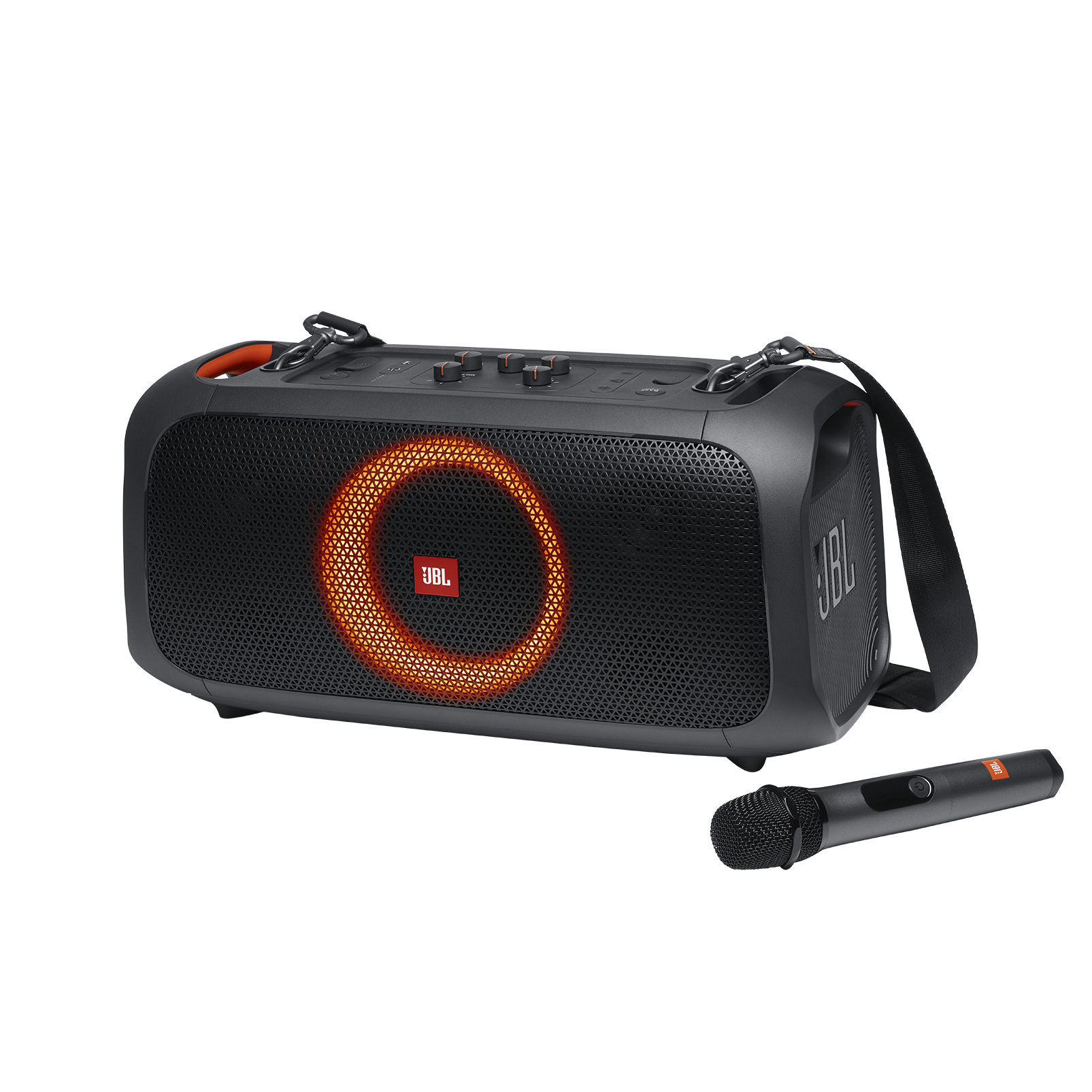 From beach parties to festivals, the JBL PartyBox On-The-Go lets you see, hear and feel the beat. Turn it up loud with 100 watts of powerful JBL Pro Sound, synched to a dazzling light show. Access your favorite tunes with Bluetooth, USB, AUX and TWS (True Wireless Stereo) connectivity, grab a friend and sing your hearts out with the JBL wireless mics, or use the instrument input to play along. With a bottle opener, padded shoulder strap, rechargeable battery and IPX4 splash-proof protection, the JBL PartyBox On-The-Go has everything you need to get the party started—and take it with you.