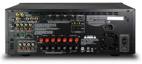 - Speaker Terminals: The receiver has binding post speaker terminals for the front, center, surround, and surround back channels. The binding posts can accept bare wire, pin connectors, and single banana plugs. The terminals are spaced too far apart for dual banana plugs and a collar surrounding the terminals prevents the use of spade connectors.