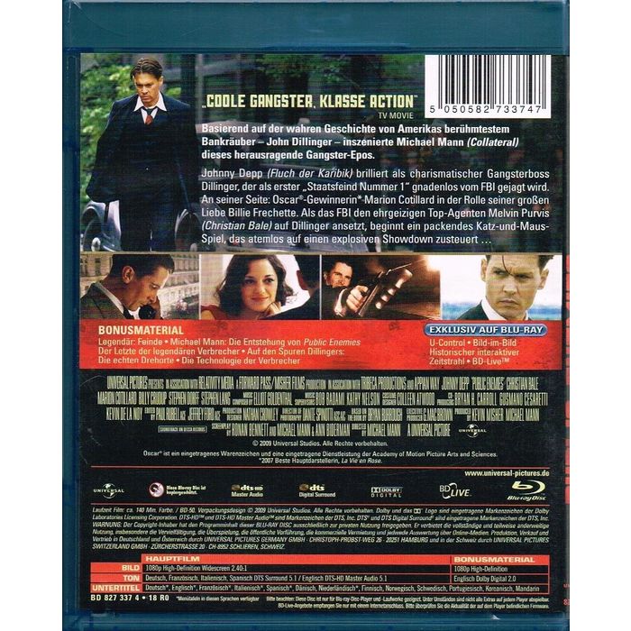 From award-winning director Michael Mann (Heat, Collateral) comes the film inspired by one of the country's most captivating and infamous outlaws - John Dillinger. Johnny Depp (Pirates of the Caribbean series) stars as the charismatic and elusive bank robber marked by the FBI as America's first "Public Enemy Number One." Academy Award winner Marion Cotillard (La Vie en Rose) plays Billie Frechette, the only woman capable of capturing his heart. Hunted relentlessly by top FBI agent Melvin Purvis (Christian Bale, The Dark Knight), Dillinger engages in an escalating game of outrunning and outgunning the FBI, culminating in an explosive, legendary showdown. "It's a landmark crime saga" (Peter Travers, Rolling Stone).
