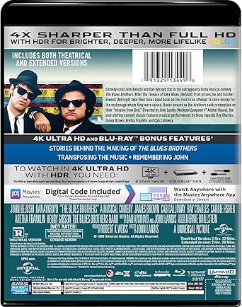 - Includes 4K UHD, Blu-ray and a digital copy of The Blues Brothers (Subject to expiration. Go to NBCUCodes.com for details.)