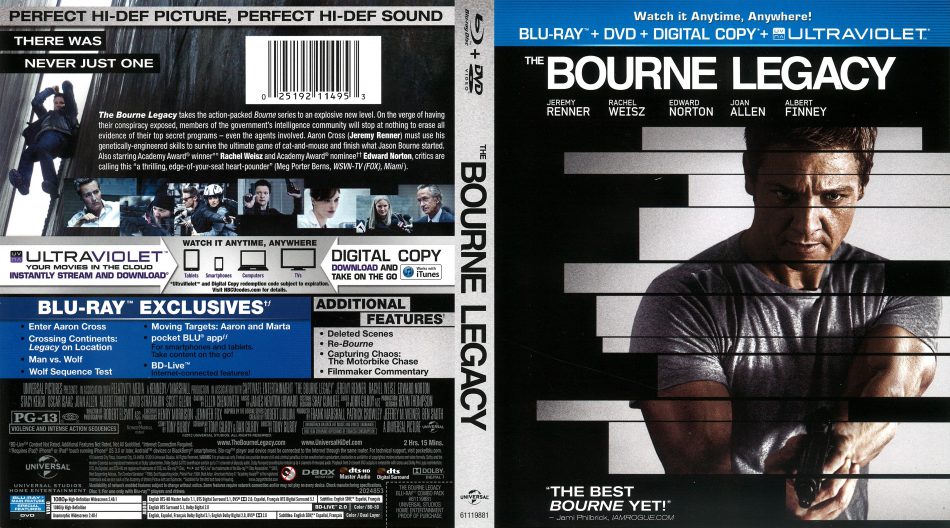 Universal’s Blu-ray version comes with a DVD and digital copy. The film is presented in widescreen (2.35:1) and in 5.1 DTS-HD master audio. The transfer is impeccable. The film comes with a commentary by co-writer/director Tony Gilroy, and co-writer/brother Dan Gilroy, and editor/brother John Gilroy, along with non-relatives cinematographer Robert Elswit, second unit director Dan Bradley and production designer Kevin Thompson. The Gilroys and Elswit also provide optional commentary for three deleted scenes (7 min.), none of which are missed. “Re-Bourne” (6 min.) addresses the challenged in making the sequel, “Enter Aaron Cross’ (7 min.) talks up the new lead, “Crossing Continents: Legacy on Location” (8 min.) discusses the film’s globe-hopping shoot, “Man Vs. Wolf” (5 min.) discusses one of the film’s set pieces, while “Wolf Sequence Test” (2 min.) shows the pre-vis and prepped stunt work for that scene. “Moving Targets: Aaron and Marta” (6 min.) speaks to the main character’s relationship, and how the actors worked together, while “Capturing Chaos: The Motorbike Chase” (8 min.) analyzes the film’s big stunt sequence. These are bland featurettes that have actors and the people behind the scenes offering platitudes. But what else would you expect?