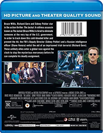 Bruce Willis, Richard Gere and Sidney Poitier star in the action thriller The Jackal. A ruthless assassin known as The Jackal (Bruce Willis) is hired to eliminate someone at the very top of the U.S. government. In order to track down this cold-blooded killer and prevent the hit, the FBI's Deputy Director (Sidney Poitier) and a Russian intelligence officer (Diane Venora) enlist the aid of an imprisoned Irish terrorist (Richard Gere). These unlikely allies enter a global race against the clock to stop the mysterious mercenary before he can complete his deadly assignment.